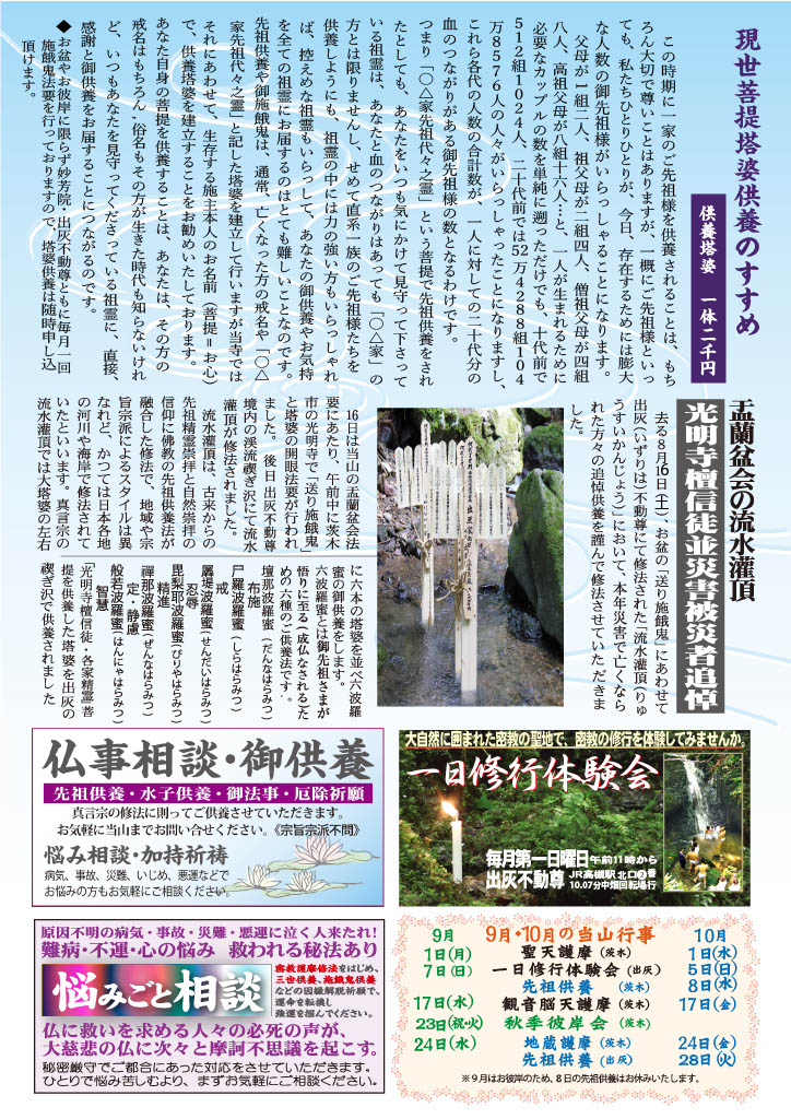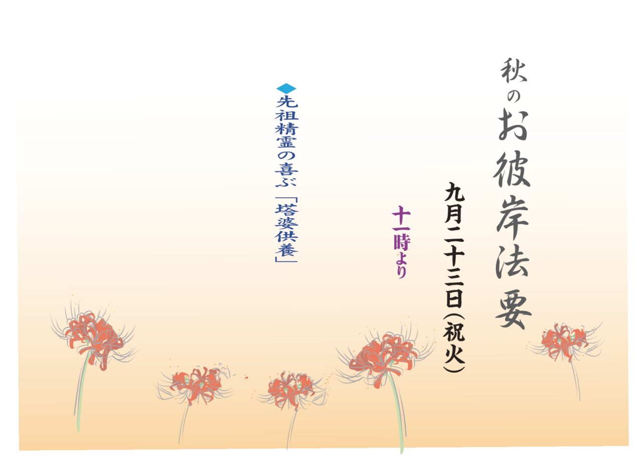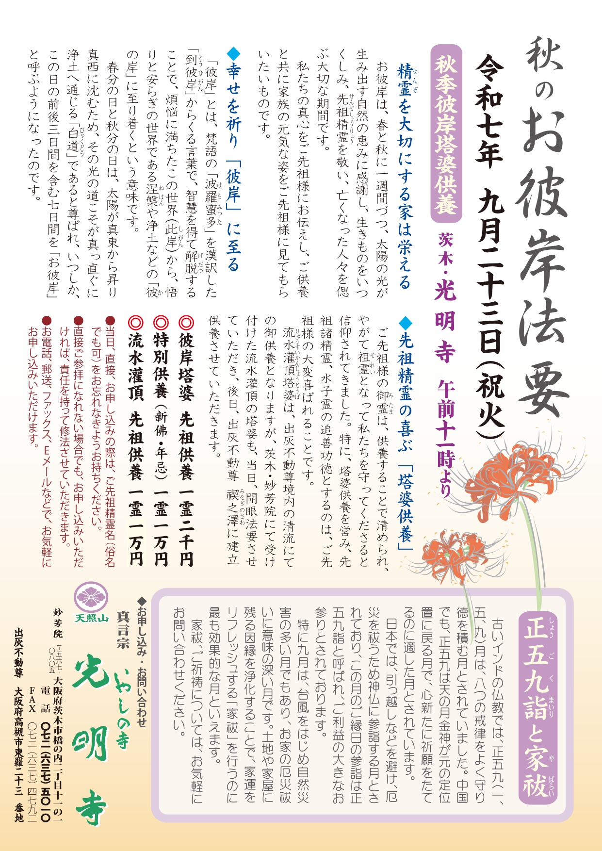 秋のお彼岸法要【9月23日(祝日・火)】 秋のお彼岸法要 ※令和7年(2025年)の開催日・・・9月23日(祝・火) 夏の暑さ疲れを取るため、 御先祖様の御供養(陰徳を積み) 新しい明日に元気に進みましょう。