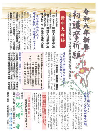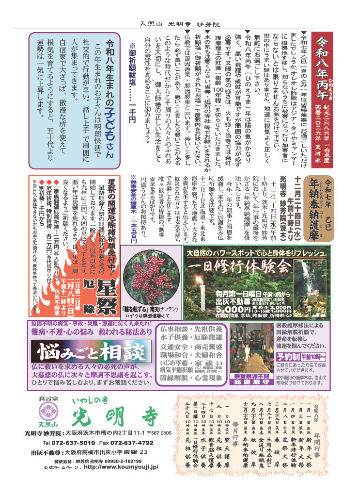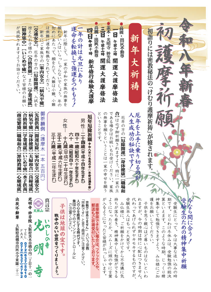 1月1日出灰不動尊、1月3日妙芳院(茨木)で開催します。